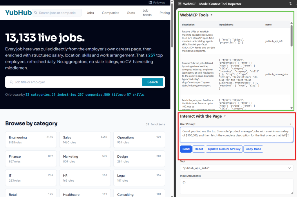 In Yubhub the WebMCP scaffold registers per-page tools. On a job page, the tool is yubhub_current_job and it returns the job in markdown. On the search page, the tool runs the search.
