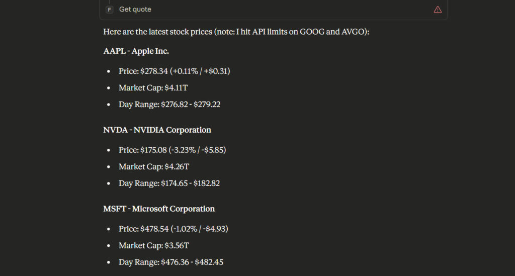 That’s real data from right now (the time of writing…). Apple trading at $278.34, market cap $4.1 trillion, up 0.11% today. I didn’t leave Claude, didn’t open a browser, didn’t copy-paste anything. Claude fetched it directly via the MCP server.