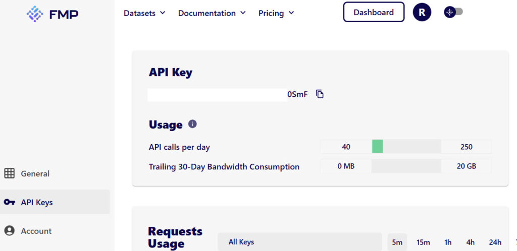 Sign up at financialmodelingprep.com. The free tier gives you 250 API calls per day – enough for testing, not enough for production work. You’ll need Starter ($19/month) for anything serious.