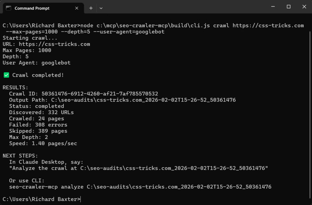 node c:\mcp\seo-crawler-mcp\build\cli.js crawl https://example.com --max-pages=2000 --depth=5 --user-agent=googlebot