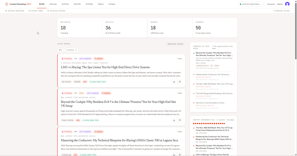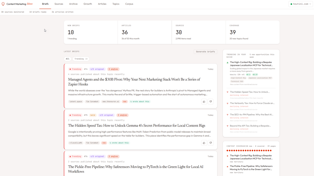 This is the core of the product and the thing I’m most opinionated about. Every content tool I’ve tried – BuzzSumo, Clearscope, the lot – gives you data. Trending topics, search volumes, keyword difficulty. Useful data, to be fair. But data isn’t an editorial brief.