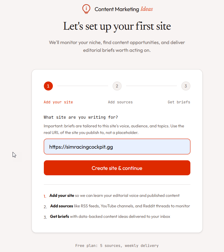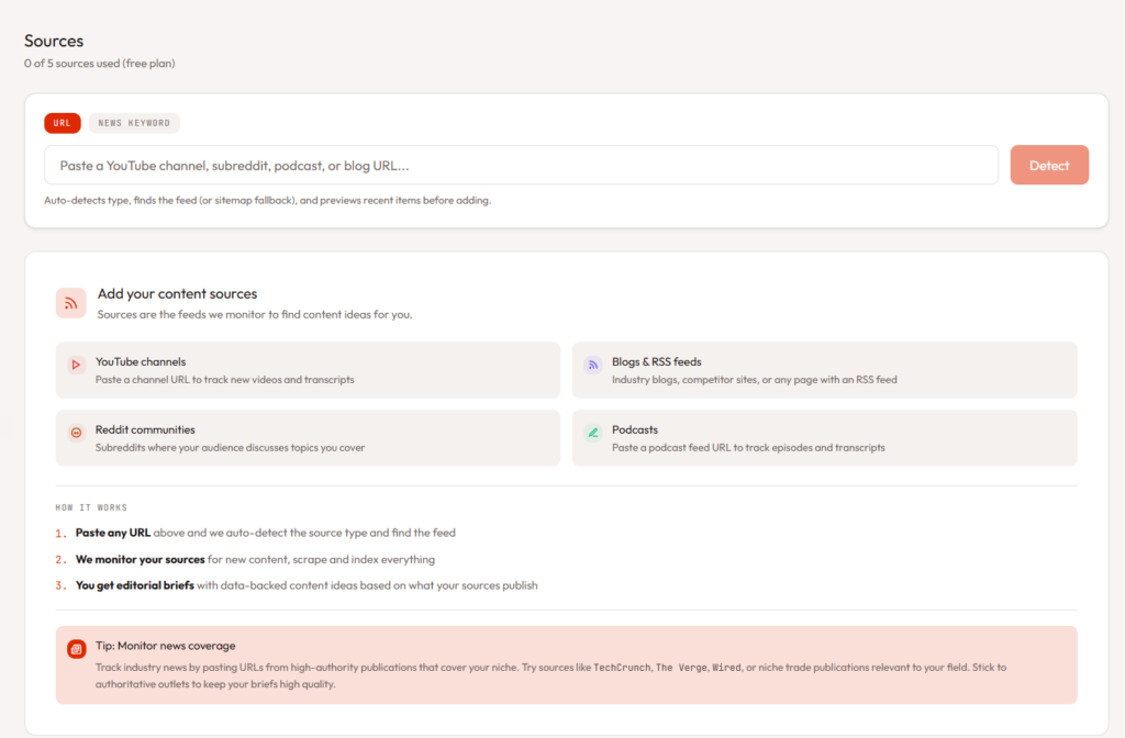 Sign up at contentmarketingideas.co, add your site URL, and start pasting source URLs (image below) The system auto-detects whether a URL is an RSS feed, YouTube channel, subreddit, or podcast. Paste a URL, hit detect, confirm the source type, and you’re monitoring.