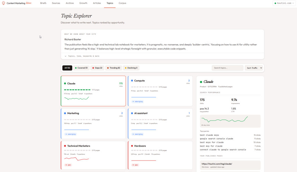 I can see at a glance that “Claude” has 175 clicks and 9.7k impressions, that I’ve published 7 pages on it, and that my average position is 14.3. I can also see that “Marketing” is a gap – 2 clicks, position 38 – meaning my audience is searching for it but I haven’t covered it well. The sparklines show 28 days of trend data so I can spot whether a topic is growing or dying.