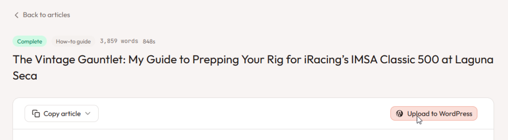 This is the feature that took the longest to build, and honestly, the one I’m least satisfied with. The system generates full articles from briefs – you click “Write article” and get a 1,300-1,800 word draft in about 90 seconds. But here’s the interesting bit: it writes in your voice.
