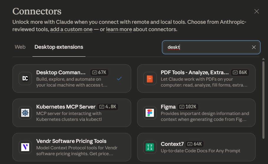 Desktop Commander opens up an entire universe to aspiring AI tool users. It’s an MCP (Model Context Protocol) extension that gives Claude direct access to your filesystem and (very helpfully) terminal. In practice: Claude can read your files, write new ones, run commands, and interact with your computer the way you would.