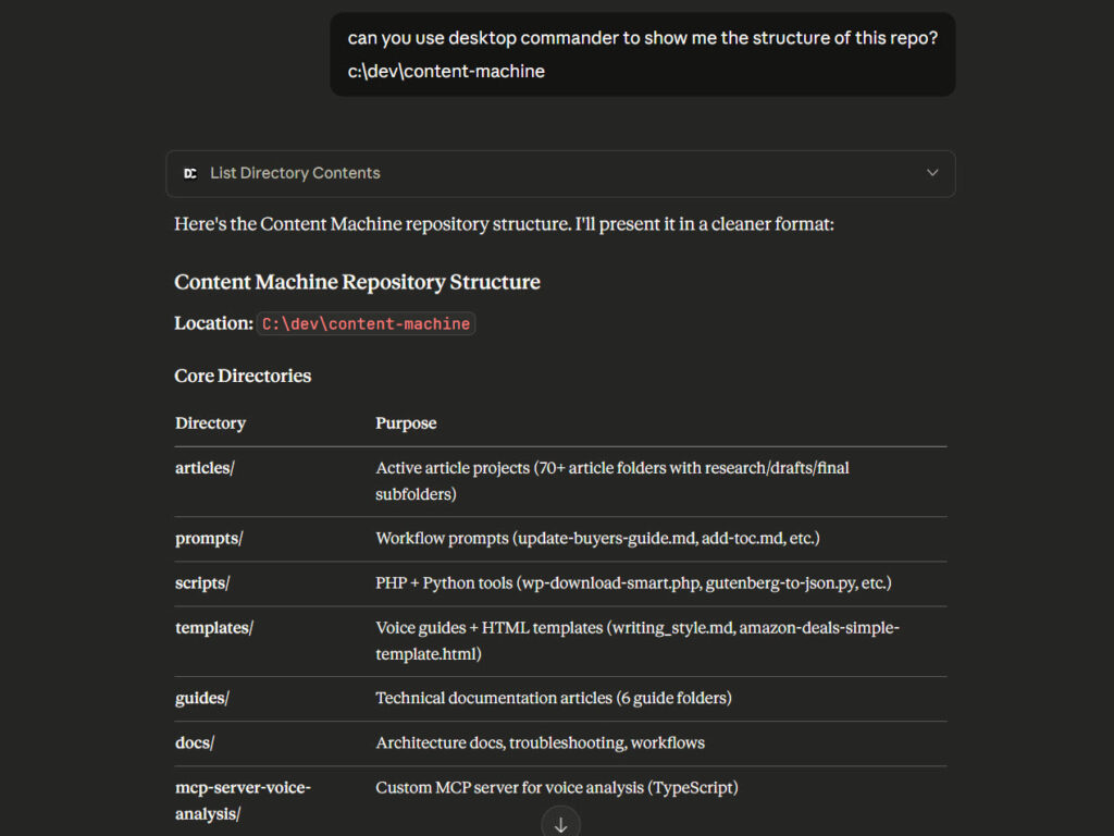 One of my projects is called Content Machine – a multi-phase workflow that updates articles with research, voice calibration, and WordPress deployment. Every step is executed through Desktop Commander, triggered via a multi-phase prompt file.