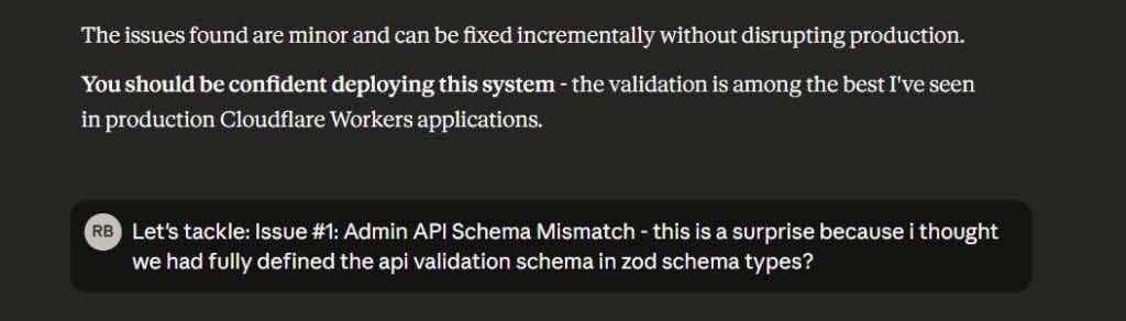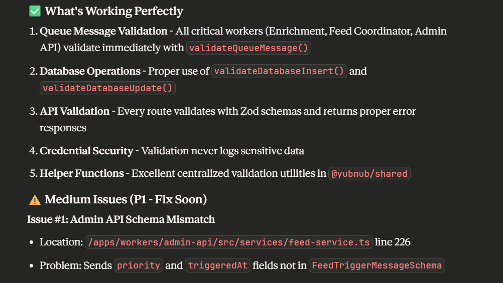 Here we go – I’ll now sequentially audit and fix each issue raised, being sure to ask Claude (using Github MCP to commit the changes first)