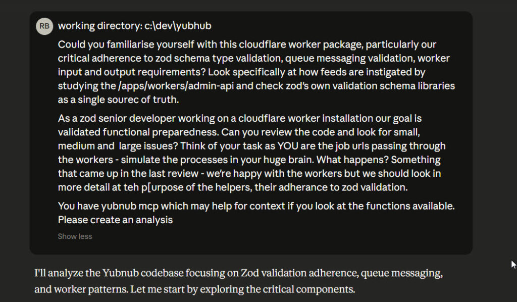 I use an initial prompt for familiarity – essentially, work through all of the files in this repository and come to terms with what it is and how it works.